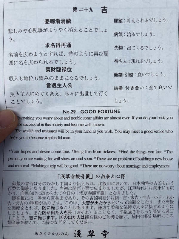 | 毎年恒例浅草寺に行ってきました。 でも、今回はいつもと違うルートで行こうと思いましたよ。なんか違うことも取り込みたい。 結果的にメトロと都営を両方使って初乗り運賃がやたらかかる複雑なルートになったけど 普段見ない景色を見たり混雑してる路線を避けたりしたので案外悪くないしあれこれ見て楽しいルートにはなりました。 なんか純粋に初乗り運賃そのままになったかは定かじゃないけど、見分けがつきにくいながらもそれぞれが別の会社扱いだから、 その辺で生まれちゃうんだよね、東京都でも西側の人とか東京近郊の各県民でもわかってない人とか大破さんとかいるから 南関東以外からの遠征や海外旅行で東京にって人とかはますますわかんなさそうだよね、東京の地下鉄ってひとまとめで見たりしてそう。 あと経路がめんどくさかったから来年はシンプルなのにするけど!いやでも来年は衝動的にまた似たようなことする可能性もある。 普段は新宿に出て大江戸線で蔵前まで行って蔵前から浅草線で1駅なんですけどね、23区に入った都内がやたらシンプルに片付く。 あと大江戸線新宿から乗ると結構すいてるし、蔵前まで長いからゆっくりと過ごせる。 帰りは始発の銀座線で座って渋谷まで出る感じ、銀座線は総じて混雑するけど始発で座ってしまえばその辺も快適。 その浅草ですが、やはりと言えばやはりなのか平日の昼間と合って海外勢が多かったです。 台湾みたいに台風進路図で出てくるくらいの距離にある国でも流石に土日を絡めて4-5日は休みとるかもしれないし、 もっと移動に時間がかかる国からだと一週間以上かけてくると考えると月曜日なんてそういうことになるよね、加えて日本人は多くが休みじゃない。 あちこちで撮影とかもしてるから止まってる人も多かったりするしで意外と動きにくいので仲見世通りにこだわらない人は店裏の路地を歩くと快適かも。 そして本殿前まで行くと広くはなるけどやはり混雑してて日差しもあってで結構大変。 さて、いよいよ年に一度の運試し、おみくじの時です。いやさおみくじの刻。 ってことで恒例の去年振り返りでもしときましょうか。 >この20周年というタイミングでこのような、皆様の期待を裏切る結果(大吉)となってしまった事には申し訳なさがある。 >しかも引いてからしばらく左端の文字しか見てなかった(=凶は一文字なので左端だけ見れば凶とそれ以外が識別可能である)ため、 >大吉だったって事に気が付くのに大分時間がかかりました。 >凶じゃないので結びつける必要がないのでそのまま回収して、裏通りから抜けるのにも時間かかったしね。 >でも大吉引いてるのに使う電車は遅延するしこの混雑(30%くらいが海外勢)、巡りはいいわけじゃないぞ! >やっぱ吉凶って体質にあうあわないあるんじゃないかな、僕大吉あんまり合わないのかも。発酵食品もそんな感じだし。 >僕は納豆が合うんですけど親父は納豆合わないらしくて便通が悪くなるって言ってましたし。 >しかしまあ書いてあることは何一つ悪くないしこの額面通りの期待ができるんなら、悪くない。 >…で、そんな感じで履歴は >凶、凶、凶、大吉、凶。凶、吉、凶、吉、半吉。 >と相成りました。凶の濃度が落ちていく…まだ世間的に言われてる凶の配合率36%を上回る数値であるのは間違いないんだけども。55%。 >20年も同じ時期に浅草寺に行ってこうしておみくじ引いてくるってやってるけど、20年それができる暮らしをできてること自体が幸いでもあるね。 >自分の暮らしや健康にしても、浅草寺の健在にしても、そこまで行くインフラにしてもどれか欠けたらできないわけですし。 去年も海外勢多かったんだね、でも今年はそれ以上の比率に感じたよ。円安の影響を感じずにいられない。 そんな海外勢に「ベテランのやり口を見てみろ、こうやるんだ!」と見せつけんばかりに出した棒は二十九。