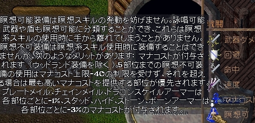瞑想可能装備の説明、これに関しては瞑想ができるかどうかよりも後半の防具による特性の説明の方が重要で、