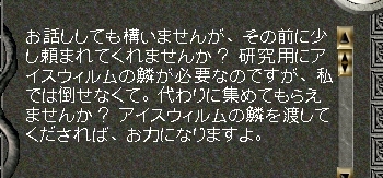 なんか話をしてくれるみたいですが、アイスウィルムのうろこを取ってきて欲しいって話。