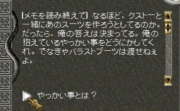 例の設計図を手に入れて、デシートにいる人に見せたら作り方がわかったという事でメモをくれました。
